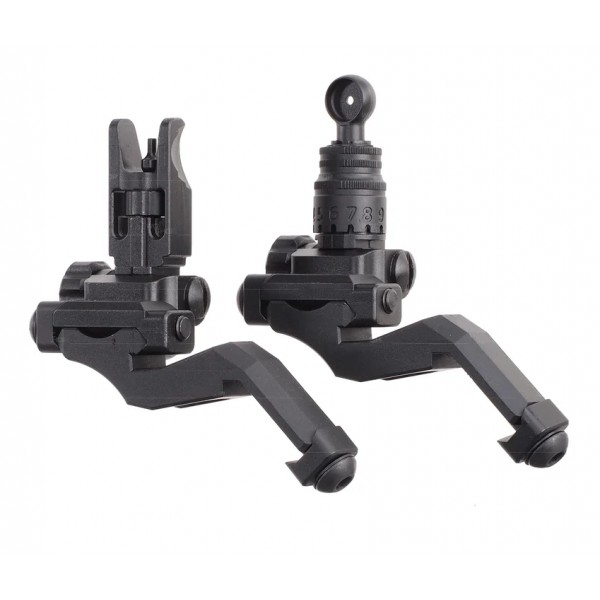 TASK FORCE Offset Folding Sight Set delivers tactical flexibility with front and rear sight, each equipped with 45-degree mounting brackets for quick-access aiming.