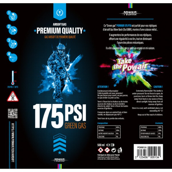 Ce "green gaz" POWAIR 175 PSI est parfait pour vos répliques d'airsoft Gaz Blow Back ( ou GBBR), munies d'une culasse métal.