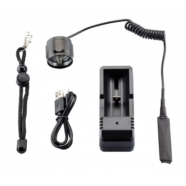 lampe torche à LED multicolores LMP1019 livrée avec 1 embout avec interrupteur déporté, 1 embout avec interrupteur tactique, 1 pile 26650 rechargeable 4000 mAh 3,7 V, 1 chargeur de pile sur Micro USB, 1 dragonne de poignet et 1 guide d'utilisation.