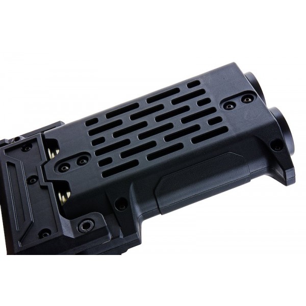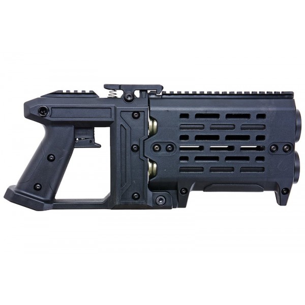 The Alpha Parts AS-40 Double Barrel 40mm Grenade Launcher is a unique double-barreled airsoft grenade launcher. This launcher has a nylon fiber body construction, making it rather robust yet lightweight. This launcher is a top-down pistol-shaped airsoft grenade launcher that has some serious Sci-Fi design cues to it, so much so, that it would look right at home in Cyber Punk.