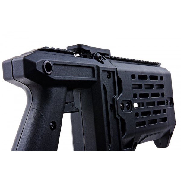 This airsoft launcher has Picatinny top rails for all your accessory needs, and QD sling slots for sling attachments. There are 2 moscart type airsoft grenades included allowing you to use this launcher out of the box. The trigger on the AS-40 is quite intresting, if you just pull the trigger, the launcher will only fire the bottom tube, while if you push the tab under the trigger down then pull the trigger, both tubes will fire.