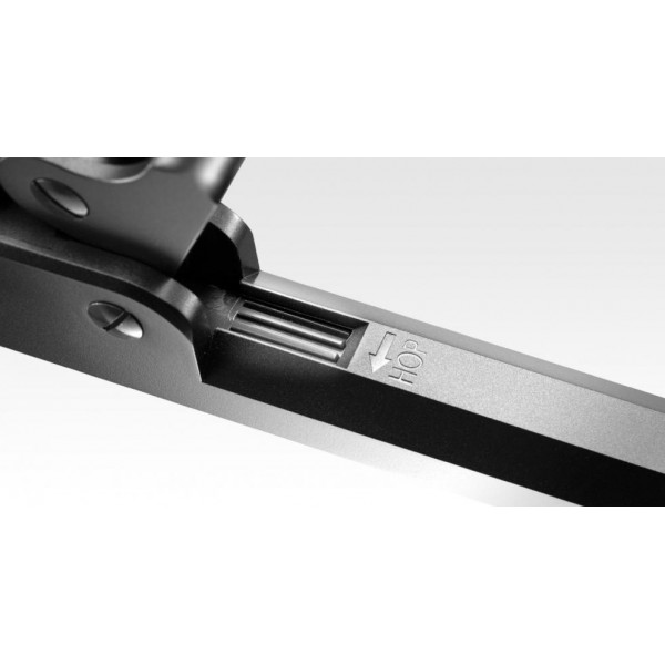 Equipped with a variable hop-up system The variable hop-up system allows you to fire BBs further with less power by imparting rotation to the BBs. The degree of hop can be adjusted to suit 0.12g or 0.2g BBs. Safety feature A safety feature in the shape of a screw is mounted on the top of the trigger. When the safety is pressed in during full cocking, the trigger and hammer are locked.