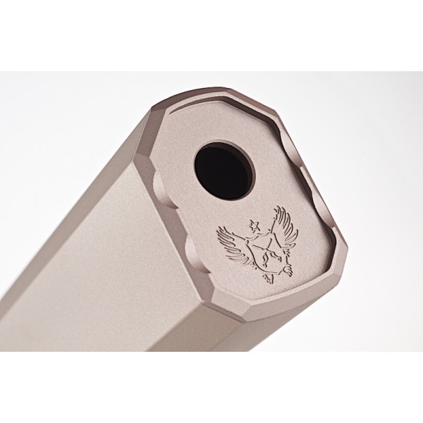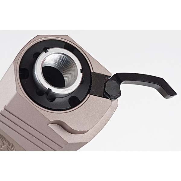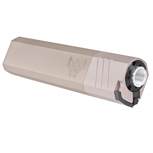 The SilencerCo Osprey 9mm Suppressor comes with one 14mm Clockwisethread cover. It's unique style and shape allows it to sit in front of a pistol without blocking the low rise front and rear sight. You don't have to worry about the angle of the suppressor as you can always fix it if the angle is a little awkward.