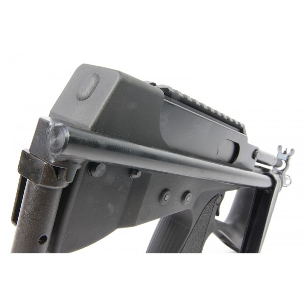 Il possède une crosse, en acier, pliable et peut être remplacée par un chargeur extra-long.