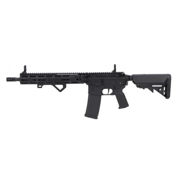 Poignee de pistolet QD pour un acces facile et rapide au moteur sans outils, oeillet double face pour le montage de la sangle tactique, avant RIS III (egalement avec les marques de la marque Daniel Defense(R)), qui est compatible avec le systeme d'armement de l'USSOCOM. Daniel Defense(R)), compatible avec les systemes RIS et M-LOK - la grip accueille la grip d'angle precedemment montee, et l'espace restant permet le montage d'un grand nombre d'accessoires supplementaires : lasers, torches, collimateurs, etc. La replique est equipee d'une crosse elargie de type SF pour accueillir la batterie, d'un viseur repliable, d'une grip de rechargement elargie et de rails RIS supplementaires de part et d'autre du lit. La replique est principalement constituee de metal, les seuls elements en polymere etant la crosse, la grip de pistolet, les dispositifs de visee, les rails RIS supplementaires, ce qui se traduit par une grande durabilite et une resistance aux conditions defavorables sur le terrain.