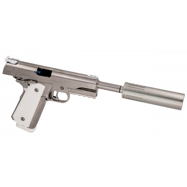 Le VX-14 est un pistolet Airsoft GBB qui regroupe les fonctionnalités habituellement trouvées sur les répliques airsoft Hi-Capa et 1911/MEU. Le rail demi-longueur et le pontet incurvé issus des modèles 1911/MEU garantissent la compatibilité avec les étuis 1911 tout en offrant un look légèrement plus « traditionnel » par rapport à la série Hi-Capa, plus audacieuse. La glissière comporte des viseurs en fibre verte, reliés ensemble à l'avant et à l'arrière par le rail de crête de glissière intégré qui a été vu pour la première fois sur l'AGENCE VX-9 de VORSK. Ce rail faîtier ajoute un poids notable à la glissière et constitue une expérience très satisfaisante lorsqu'il rebondit sur le ressort de rappel lors des engagements. Il renforce également le profil latéral du pistolet, lui donnant un aspect très volumineux par rapport aux modèles standard 1911/MEU. Une autre fonctionnalité empruntée à l'AGENCE est l'inclusion du kit de suppression d'extension de canon à alésage serré de 6,03 mm qui contribuera à fournir une petite augmentation du FPS et de la portée, idéal pour la portée cible et complétant le look de cette arme de poing imposante. La poignée du pistolet est en plastique moulé par injection, offrant une poignée suffisamment robuste mais visiblement épaisse grâce au chargeur double empilé à l'intérieur. La poignée présente un motif en forme de « v » que l'on retrouve également sur le bouton Mag-Release, une autre touche agréable.
